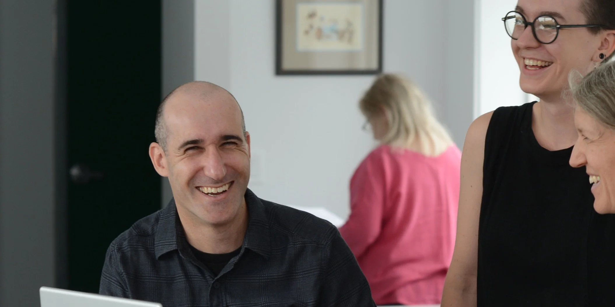Ben Brezner, Marketing Director of Two Bridges Digital Marketing, looks to the right, while a woman with short, gelled hair smiles and looks down towards the right of the camera.